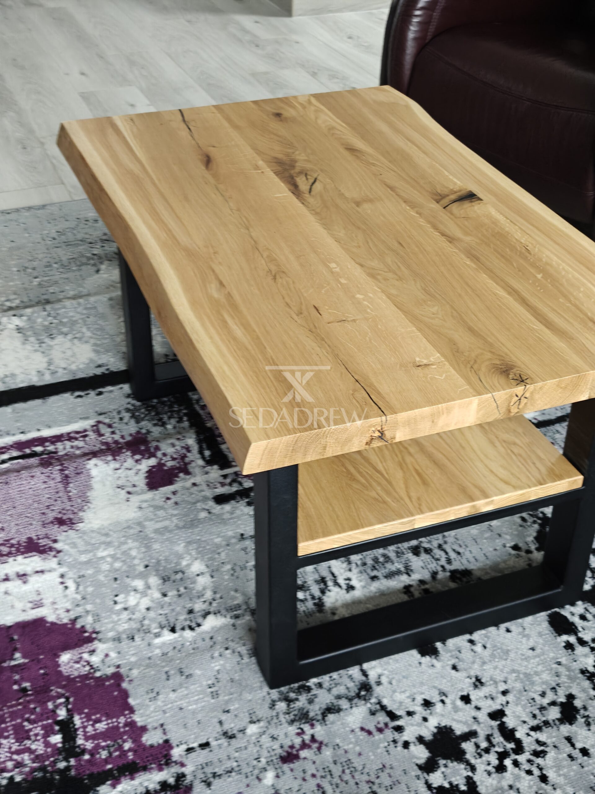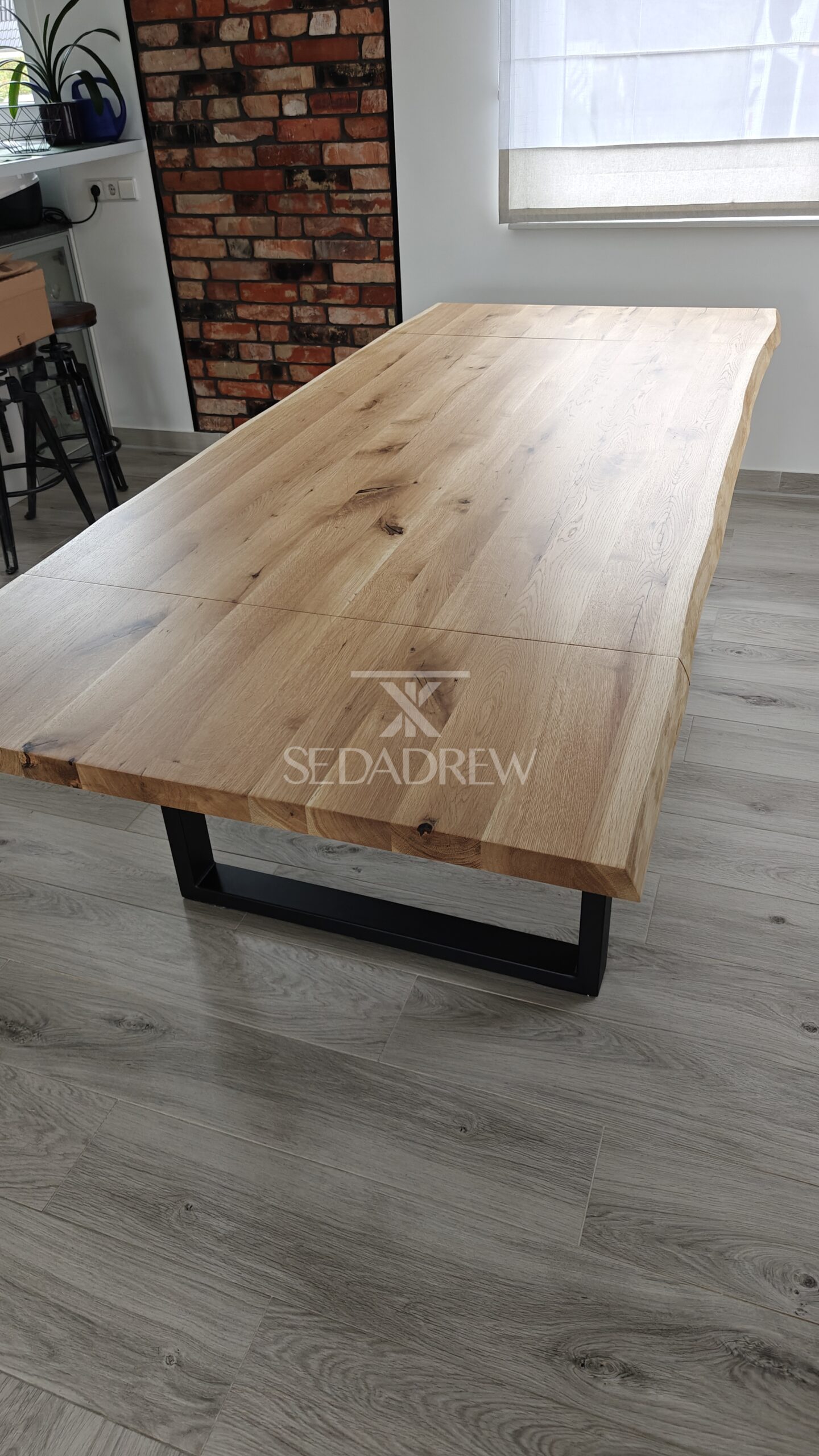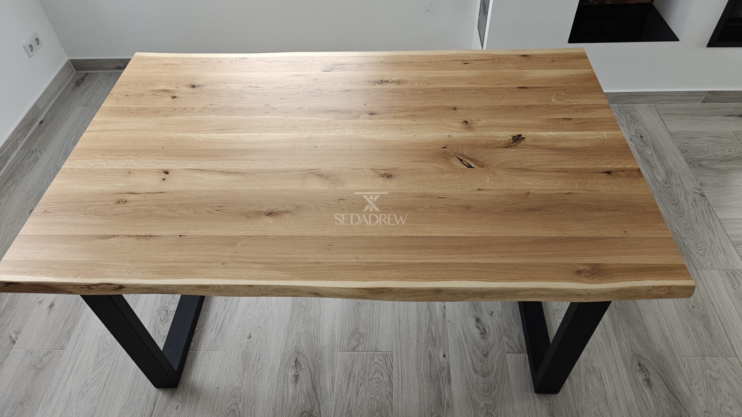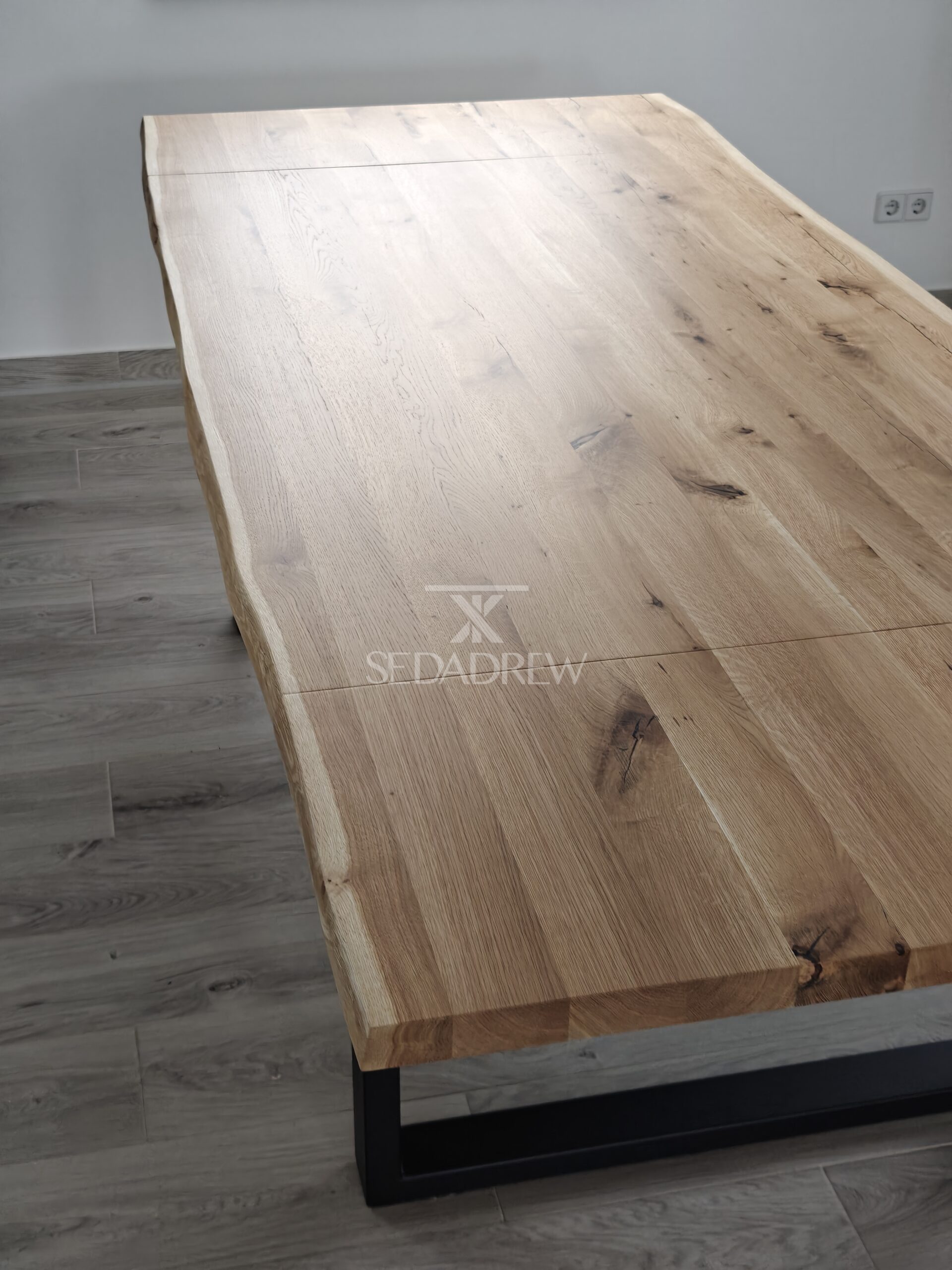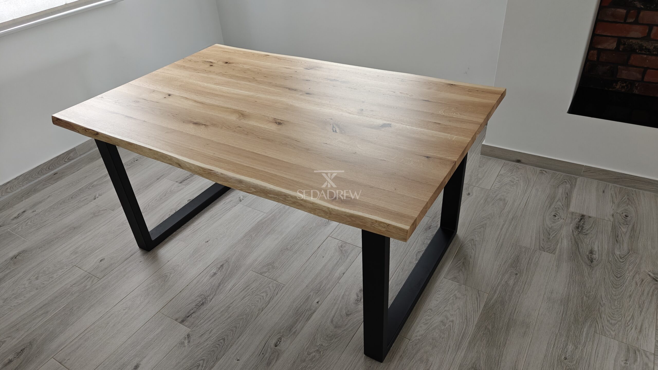 1) st贸艂 w wymiarze 160x100cm na nodze typu “U” z dwoma dostawkami bocznymi po聽 40cm, wzmocnienie w postaci stalowej ramy pod blatem, obrze偶e blatu oflis (naturalne, nieregularne)