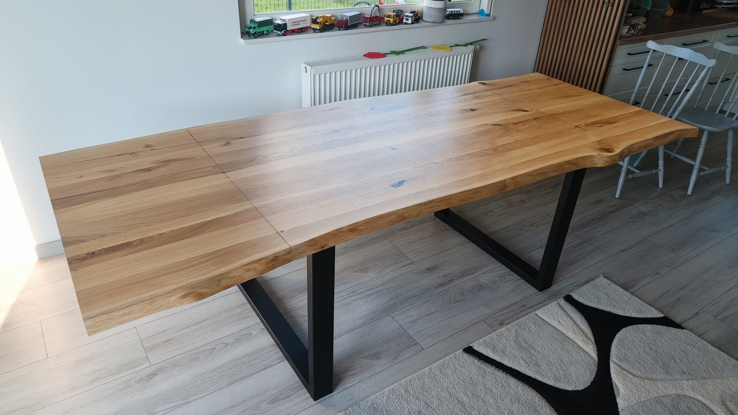 Nasza realizacja w Suszcu to propozycja dla osób, które kochają surowe, bliskie naturze materiały, ale dysponują ograniczoną przestrzenią. Stworzyliśmy stół dębowy na wymiar, którego krawędzie zachowują swój naturalny, nieregularny kształt. To mebel, który na co dzień nie przytłacza wnętrza, a w razie potrzeby staje się gotowy na ugoszczenie całej rodziny dzięki sprytnemu systemowi powiększania blatu.