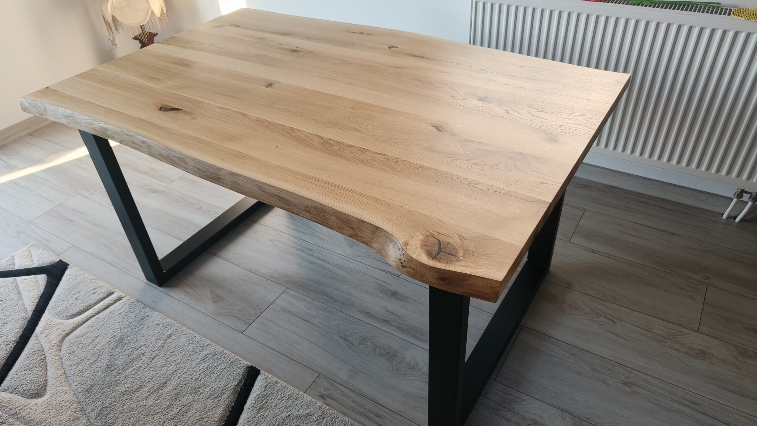 To, co wyróżnia realizację w Suszcu, to krawędź typu live edge. Blat nie został docięty w linię prostą, co sprawia, że każdy centymetr krawędzi jest unikalny – to natura dyktuje tutaj kształt mebla. Dzięki zastosowaniu dębu w klasie rustykalnej, stół posiada wyraźny rysunek drewna, który ociepla industrialne wnętrze.